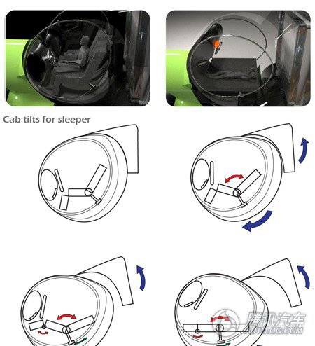 卧铺驾驶室看起来和普通的卡车驾驶室没什么区别,但是可见度更高。其内部结果就会更收到司机师傅们的青睐了。这个驾驶室可以旋转,可以让开车者在里面找到适合自己的姿势,美美的小睡。而且,这里面还有一个可以存储小物件的小梳妆台。当司机睡眠的时候,驱动器踏板的位置已被锁定到驾驶室下面,这样就确保了安全。里面的座椅展开,就可以构成一个非常舒服的泡沫床垫。