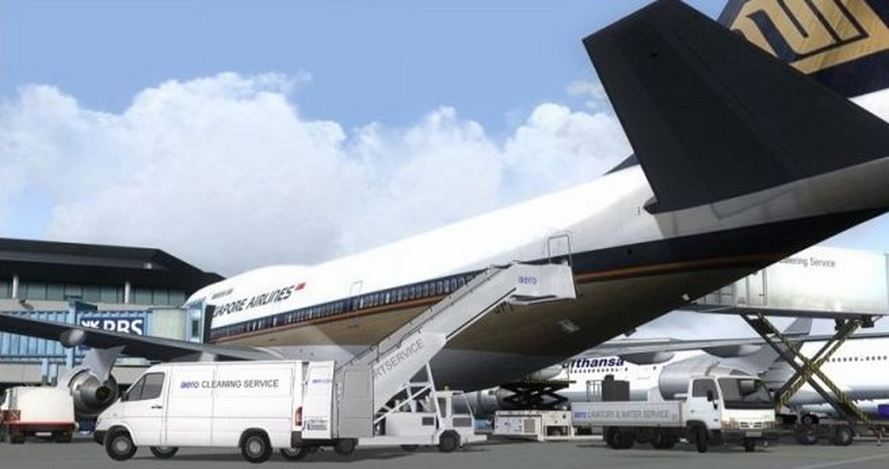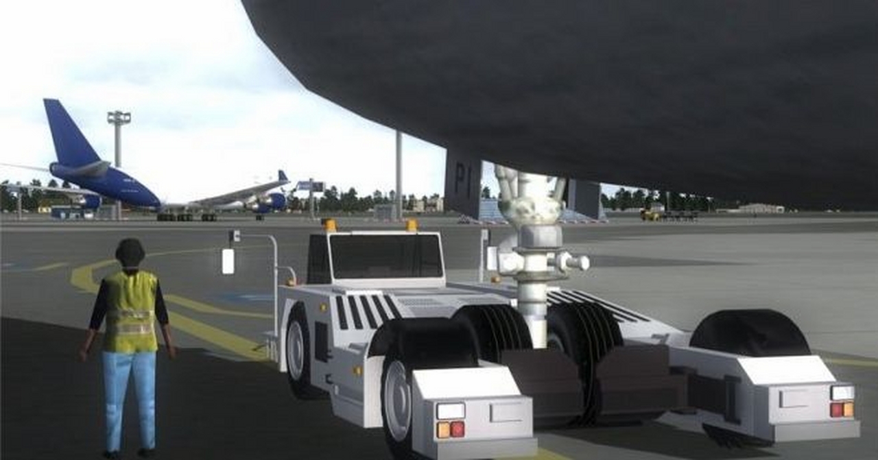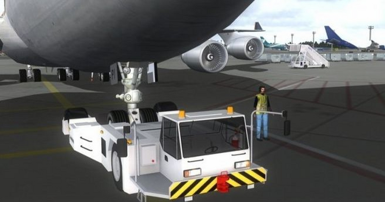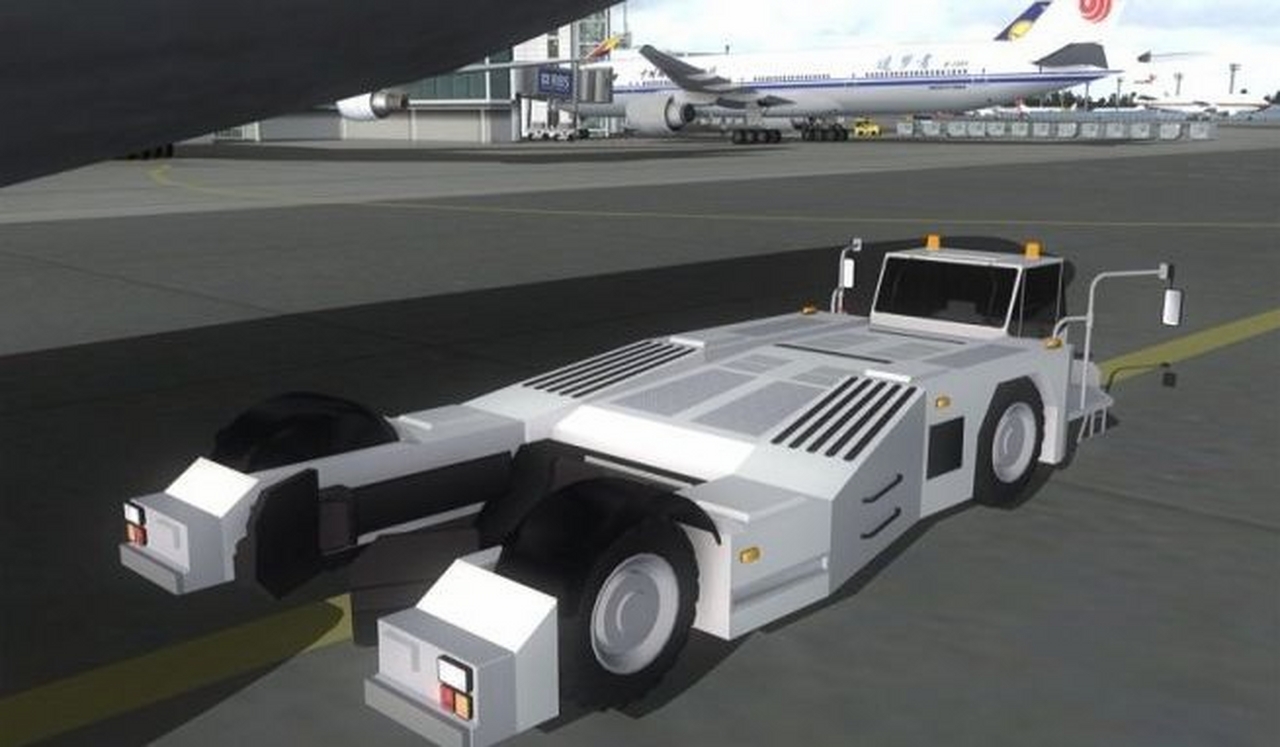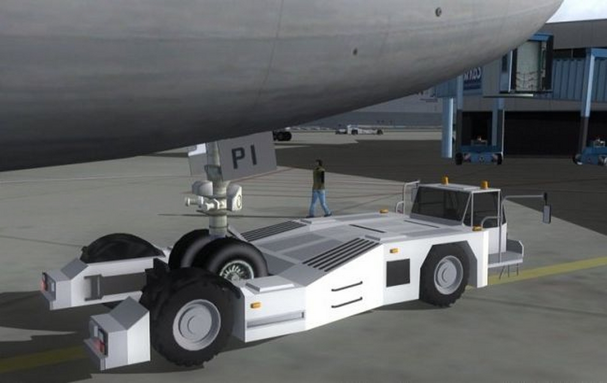 當你降落後,或起飛之前。引導車會在滑行道出口等著你,送你到你想去的停機位。引導車的速度還會和你的飛機同步,連轉彎的時候也會打起轉彎警示燈。接近停機位時,引導車會被停泊指揮員替代,他會指導你精確地停入位置。指導的同時還會通過耳機告訴你木楔有沒有放入。同一時間登機橋會緩緩地貼近機身。不僅一個,而是兩個登機橋,A380 甚至可以用三個登機橋。登機橋連接的位置由你設置。出發之前後收回,收回的時候在駕駛艙裡甚至能聽到登機橋的警報聲。地勤人員會駕駛後推車把你從機位推出,推出的位置要比FSX 默認後推準確多了。後推完畢後指揮員會通知你滑行到跑道。