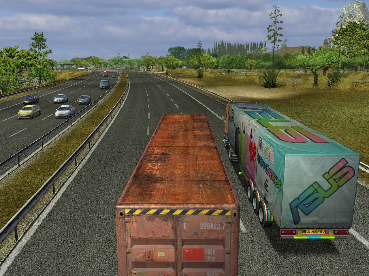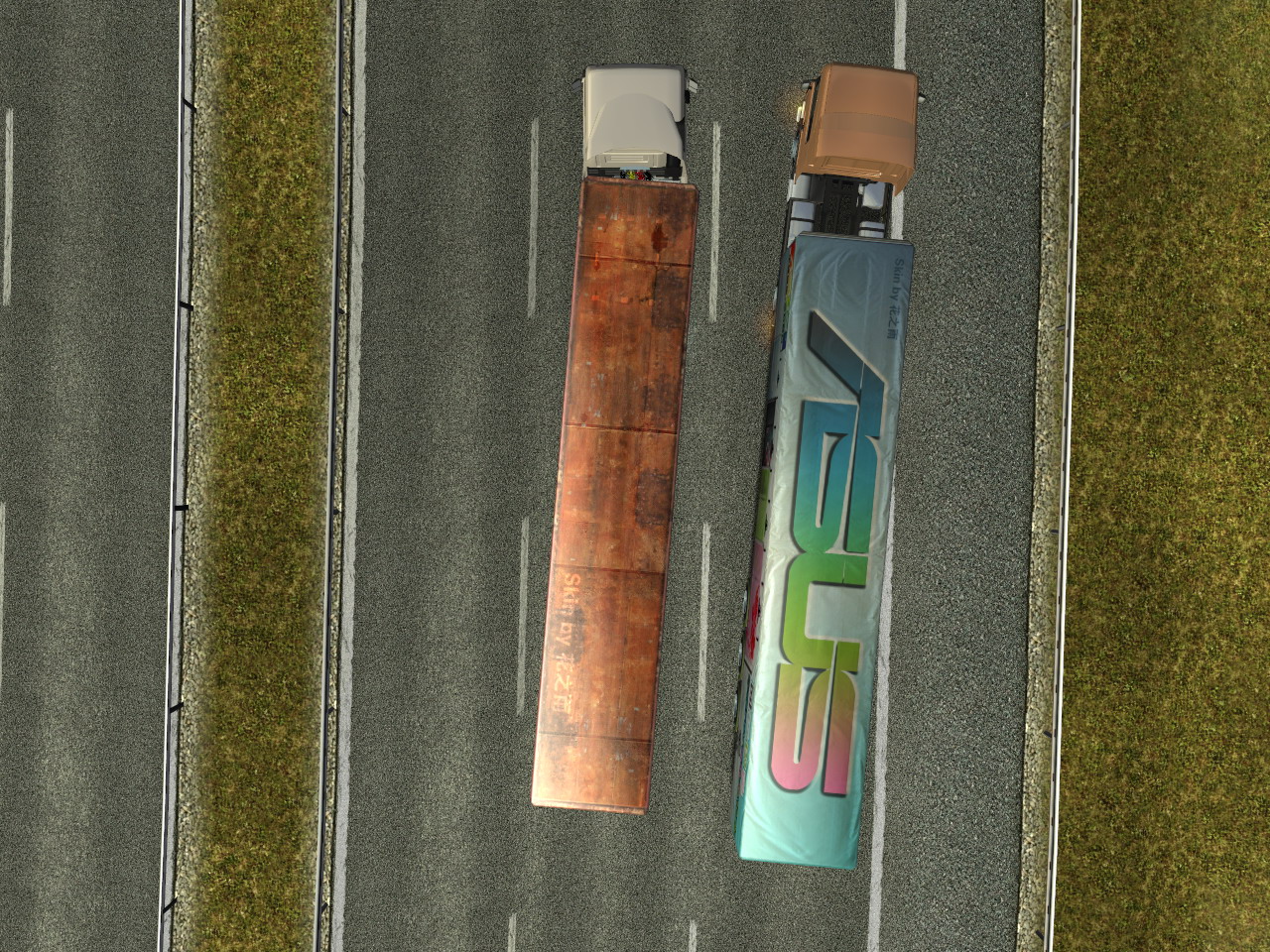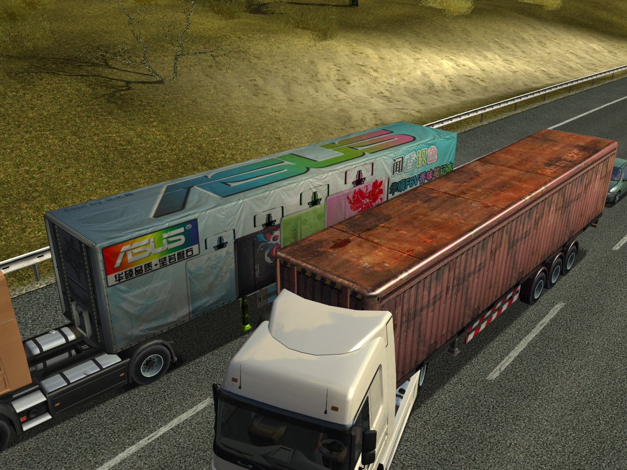 今天经过四个小时奋斗,终于初步完成了第一款模拟真实型货柜皮肤,这个货柜是基于ETS原版货柜制作的,素材是我历经艰辛得来的,网络绝对找不到这样的素材(起码现在我还没找到过类似的 ^_^)。此皮肤清晰度(分辨率)是ETS原版货柜的两倍,属于高清皮肤。由于只是贴图制作,所以无法修改原版的模型,将就下吧。