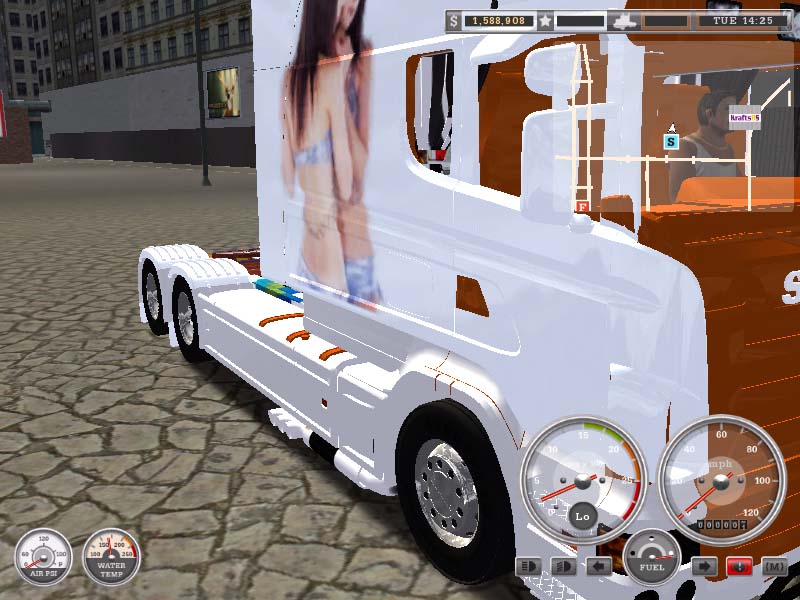 此车在原SCANIA LONGLINE (MOTOROLA)基础上加长拖架,直接带来的好处是双侧油箱加大,让你加一次油路的更远,拉的更多,特别赠送美女白色皮肤,整车素气大方,少了些重卡霸气,多了些雅致