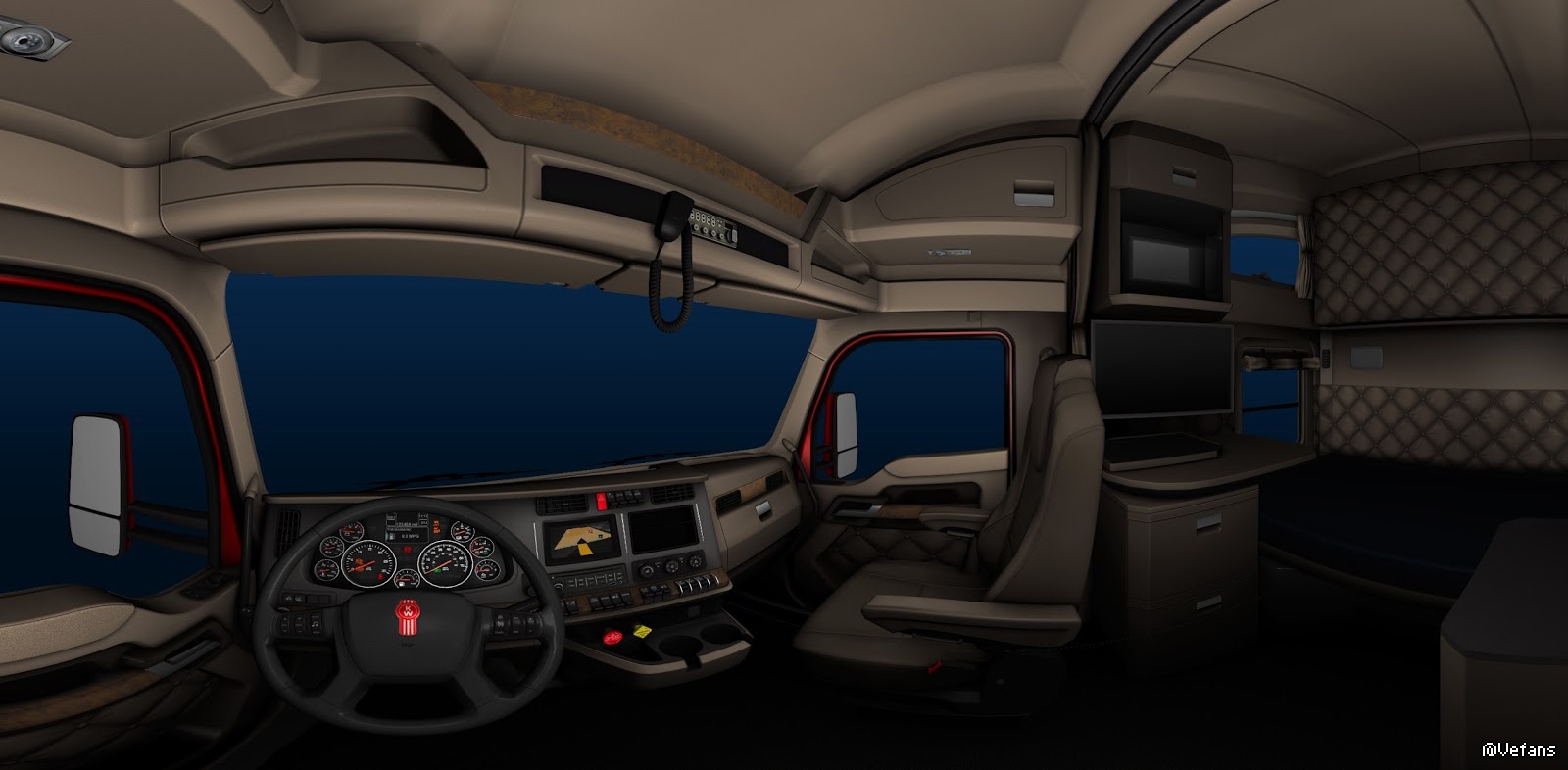 As you may know American long haul truck tractor cabins are typically more spacious then their European counterparts as there is no on-road vehicle length restrictions. This is providing more "operational" space for the driver. We went all the way to model this space, as visible on the interior panoramic shots.