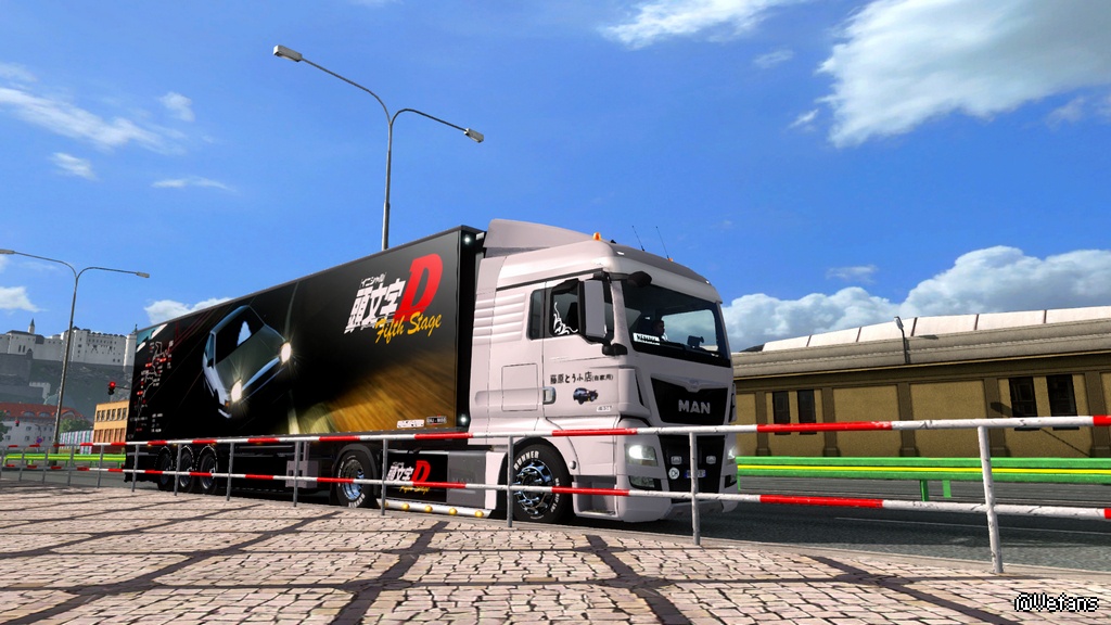 头文字D套装组合MOD,此款MOD包含一套头文字D皮肤和一组独立货柜,使用此MOD需下载(MAN TGX Euro 6)车头配合使用,下面有车头下载地址