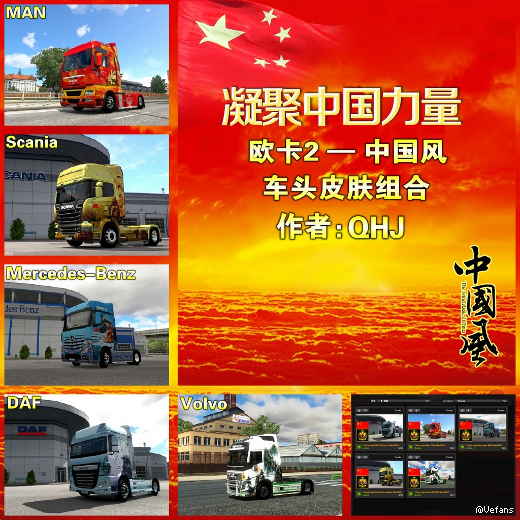 经过将近两天的制作,中国风元素车头皮肤正式出炉,内部包含五款车型的皮肤,其中包括:MAN、斯堪尼亚、达夫、奔驰MP4、沃尔沃。使用时可一次性全部加载使用!