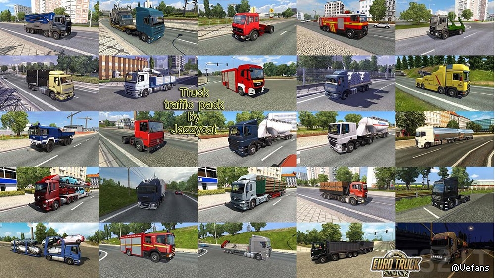 Pack adds in traffic 78 trucks and BDF’s (Mercedes Benz MP2, MP4, Axor, Antos, SK, LK, NG, Atego, Scania 143M, 164L, P-series, Iveco Eurocargo, Volvo F10, FH12, FMX, FL7, MAN TGA, TGS, F2000, TLF, Kat-1, Pegaso Troner, Tatra Phoenix, DAF CF, Renault Premium DCI, Kerax, Major, various variants of bdf’s and special trucks).