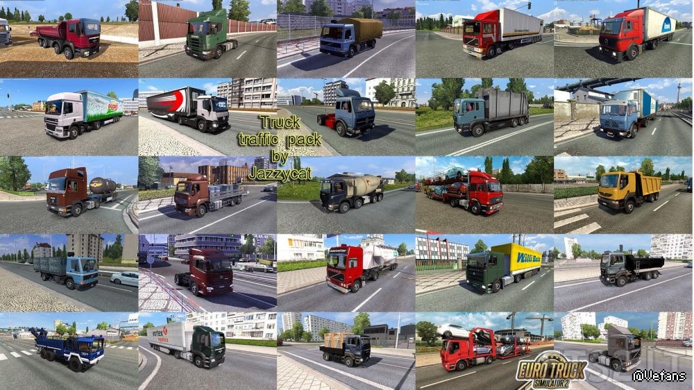 Pack adds in traffic 81 trucks and BDF’s (Mercedes Benz MP2, MP4, Axor, Antos, SK, LK, NG, Atego, Scania 143M, 164L, P-series, Iveco Eurocargo, Volvo F10, FH12, FMX, FL7, MAN TGA, TGS, F2000, TLF, Kat-1, Pegaso Troner, Tatra Phoenix, DAF CF,Renault Premium DCI, Kerax, Major, various variants of bdf’s and special trucks).