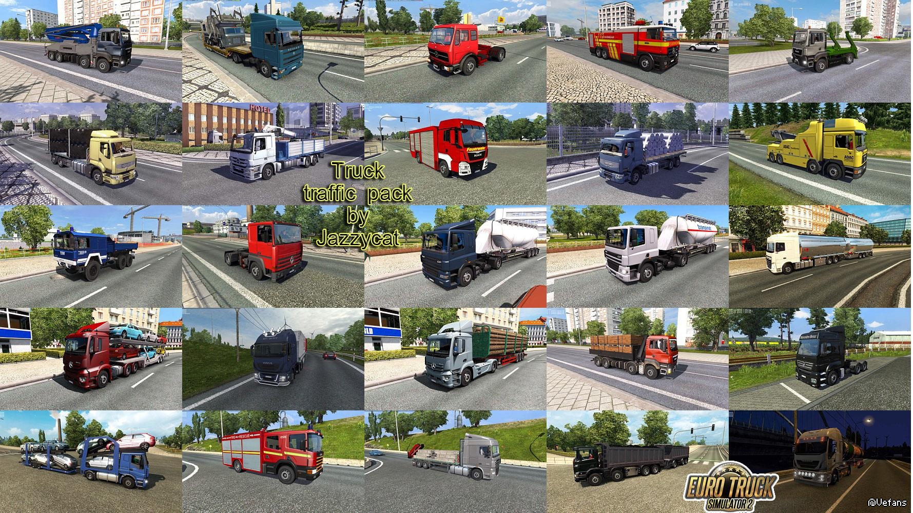 Pack adds in traffic 90 trucks and BDF's (Mercedes Benz MP2, MP4, Axor, Antos, SK, LK, NG, Atego, Scania 143M, 164L, P-series, Iveco Eurocargo, Volvo F10, FH12, FMX, FL7, MAN TGA, TGS, F2000, TLF, Kat-1, Pegaso Troner, Tatra Phoenix, DAF CF, Renault Premium DCI, Kerax, Major, various variants of bdf's and special trucks).