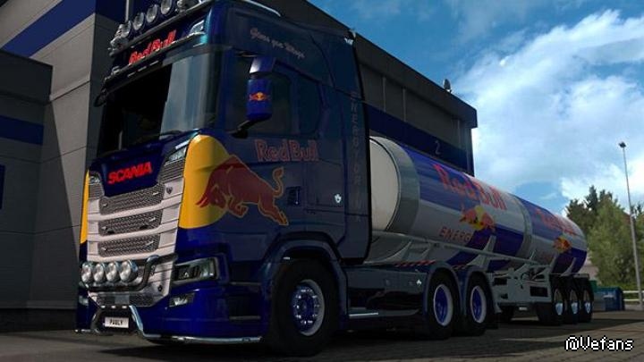 RedBull Energy Drink Combo,so this combo is for the ScS Scania S and the Can Tanker Trailer V1.0,you also get Painted Wheels with the RedBull logo on them.