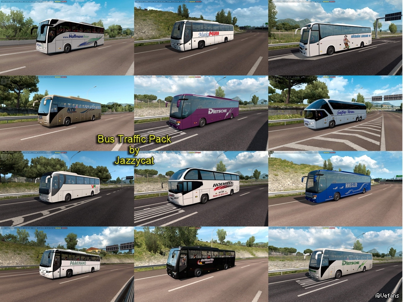 Pack adds in traffic 37 new models of buses with 947 skins (Setra, Neoplan, Volvo, Man, Mercedes-Benz, Ikarus, Ayats, Irizar, Scania, Temsa, Jelcz, Karosa, Caetano).