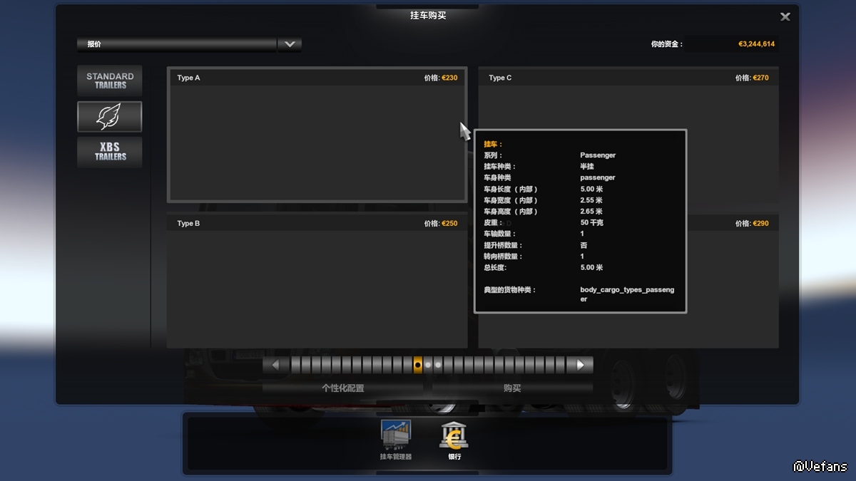 2,请购买巴士,然后到挂车销售商购买客运模式配套挂车(如图三),再将挂车连接,之后再去货物市场(注意:是货物市场,不是货运市场)。