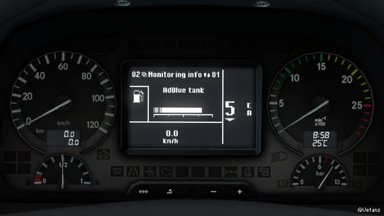 This dashboard computer mod aims to recreate accurately the dashboard computer found in the stock Mercedes-Actros MP3 in-game.