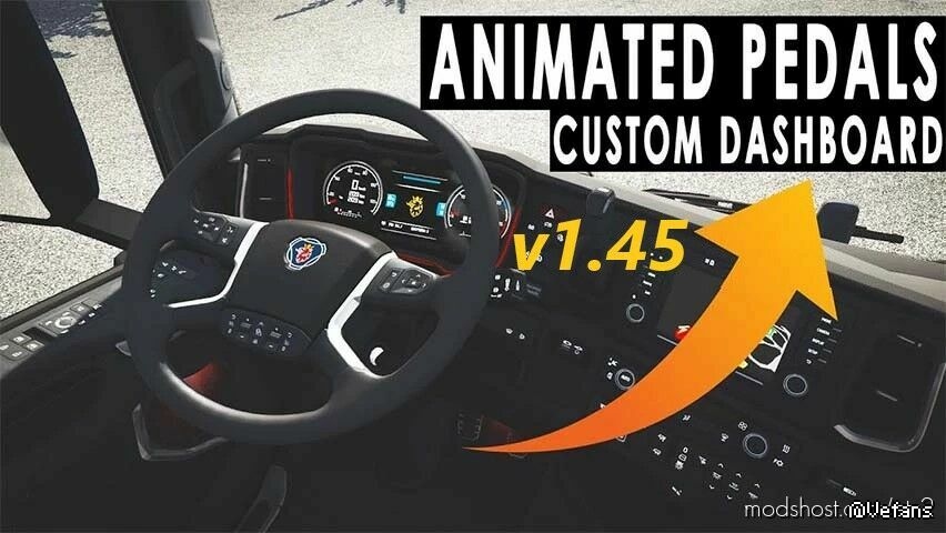 动画方向盘和踏板 + 2016 年斯堪尼亚 R&S 的自定义仪表板。重新排列元素,使更多信息一目了然。字体越大,更易于阅读。还具有转向动画。