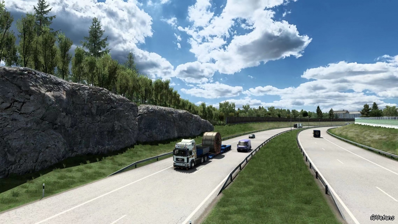 JBX+PNG的话你得到的是JBX的阴影设置而不是PNG的。JBX阴影太假而且固定的基本没有一样。说人话是艳丽如同他的天空盒一样突出一个亮字!你都用PNG的PBR的材质包那就基本上只剩下卡车和拖车的高清纹理!这个要你自己做了比如皮肤下包含【车牌.挡泥板.灯箱,外挂的部件,内饰的一些材质等等】做到4K分辨率要你PS处理好,不是简单的放大!比如图下的蓝色翻毛皮材质或都这个车的皮肤我会根据它车牌所有的地要求的字体和标准尺寸重新一套车牌。我更喜欢PNG的阴影设置,我上调了【uset r_sun_shadow_texture_size "16384"】有狗牙不是很正常的吗?游戏的采样率就这样你用什么方法都是略有改善并不能消除!