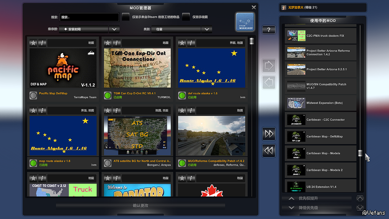 提供了全地图MOD下载,用咖啡背景的话车载小屏幕导航不显示。排序里面没有夏威夷和大西洋项目,个人不喜欢。