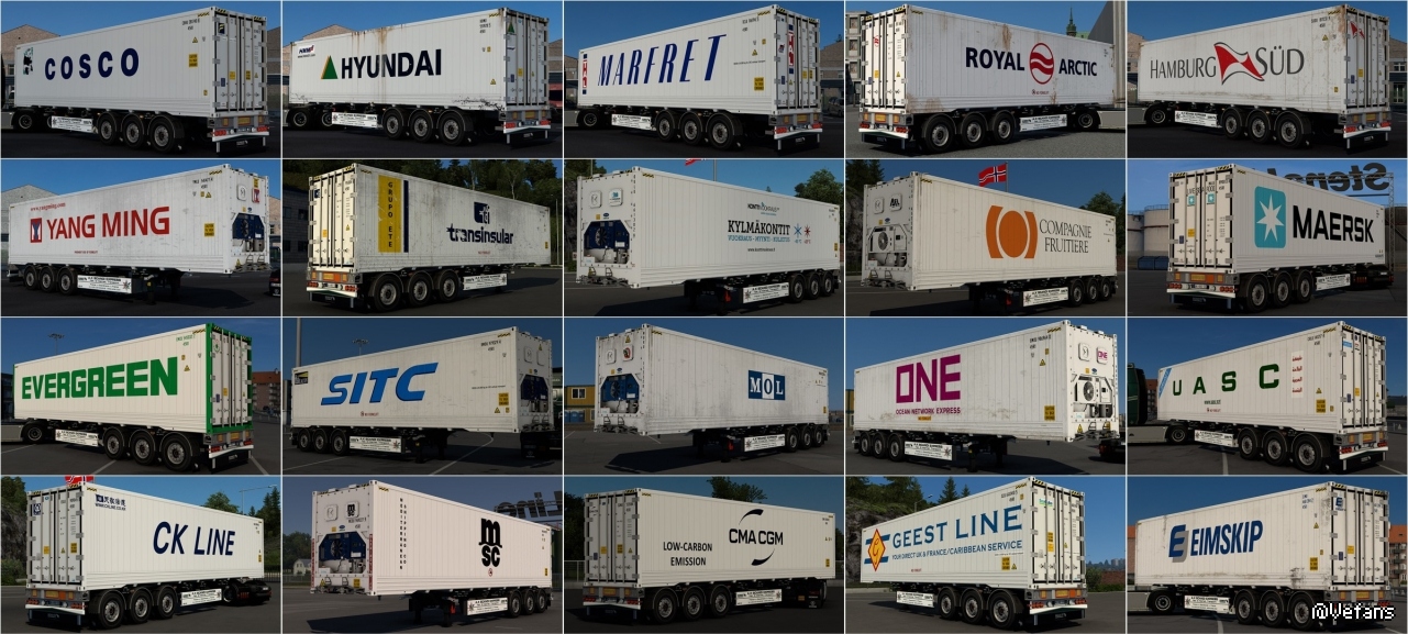 - Full compatibility with the SCS, Krone, VAK V-Slider & Schmitz S.CF chassis configurations (HCT, B-Link, singles, doubles, flatbeds, etc... everything that uses 20ft, 2x20fts, 45fts and/or 40fts) - Available in the freight Market & for owned trailers - About the 45ft containers : you can only use them if you own one of the two new dedicated 45ft chassis available (new variants for the SCS chassis), they are NOT available for the freight market - The skin-selection is made randomly by the game (same system as SCS's original containers) - All container variants in traffic - Supports both default & custom dedicated cargos : --> Default cargos : just use the same cargos as you usually do and the default skins will be replaced by mine --> Dedicated cargos :search for "Box Container SC" OR "Box Container HC" OR "Reefer Container" OR "Reefer Container HC" OR "ISO Tank Container" OR "Flatrack container" OR "Open-Top container", depending on the type of container that you want