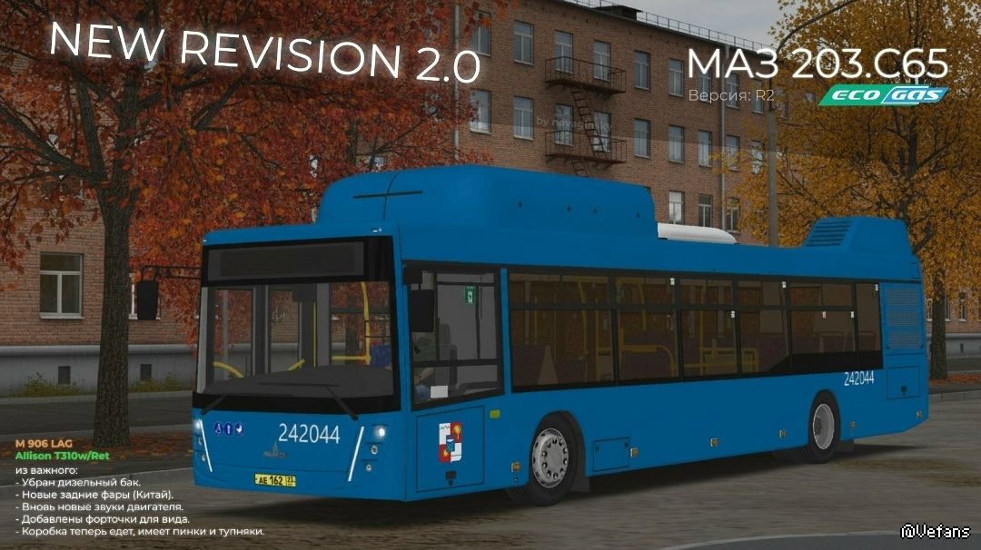 Список общих исправлений: > Исправлены/переписаны скрипты » двигателя и коробки передач, пневматики и тормозов, подвески. > Был исправлен тупняк коробки и kickдауна. > Cделана реализация под Allison T310w/Ret на 50%. > Коробас теперь фигачит в отсечку и пинается. Короткие передачи (вариант 1/4). > Реализация мощности двигателя M 906 LAG. > Новые звуки (абсолютно все) (60% by Kajosoft). Вырезка недочетов изначального автора этой залупы. Переделаны 30% текстур автобуса. Убран дизельный бак, убраны торчащие из под стекла наклейки. Добавлено больше форточек для схожести с реальной моделью. + некоторые текстуры с текстом перевёл на русский язык. Что по звукам? » > Новые звуки двигателя Mercedes-Benz. (906/926) > Новые звуки коробки Allison T310w/Ret. > Новые звуки деталей автобуса; (двери, скрип, люки, форточки, взаимодействие с кнопками, звук колёс в движений, дворников, сигнала и.т.п). + Корректировки громкости всех звуков. ДОП-INFO: Более пяти вариантов .bus -> на каждой версии описаны свои различия, основной бус "вариант 1" Удалены по-мелочи лишние файлы, которые не используются в этом автобусе. Общий вес файлов-автобуса стал ниже в момент разработки на -127 мб. + Сочинская перекраска реального автобуса, и обычная стоковая белая. + Можно поменять сидушки, просто кликни по ним в салоне. Автобус более приятный для вождения, (в большей части на игровом руле, нежели на мышке и клавиатуре). с виду не скажешь что это скрин-машина. Минусы: всё ещё не соответствует реальному прототипу, баги от начального автора. ЭМУ поддерживает только английский язык ! ! ! КРЮГЕР в комплекте.