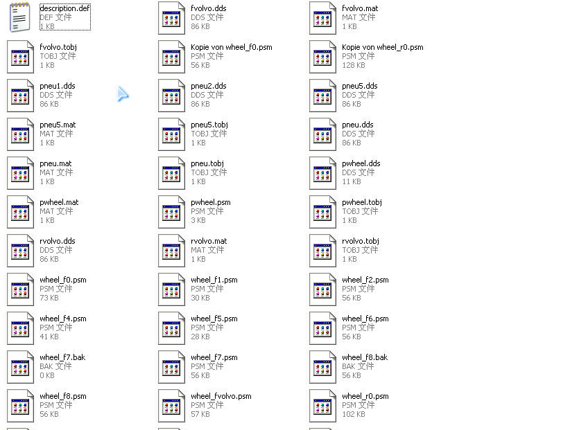 有文本文档和其他的文件,扩展明是psm的代表车轮几何参数,扩展名是mat的代表贴图文件,其他的我就不知道了,这些都不用管,那是以后的事