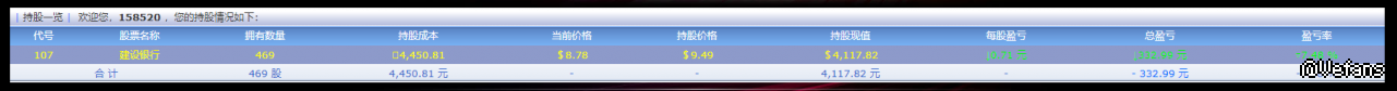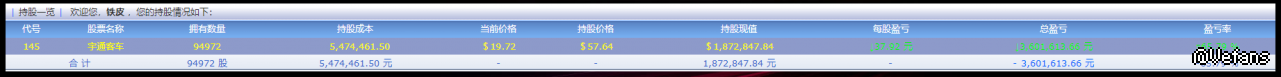 代号 股票名称 拥有数量 持股成本 当前价格 持股价格 持股现值 每股盈亏 总盈亏 盈亏率 139 华邦健康 10265 149,309.56 $8.74 $14.55 $89,716.10 ↓5.81 元 ↓59,593.46 元 ▽39.91 %