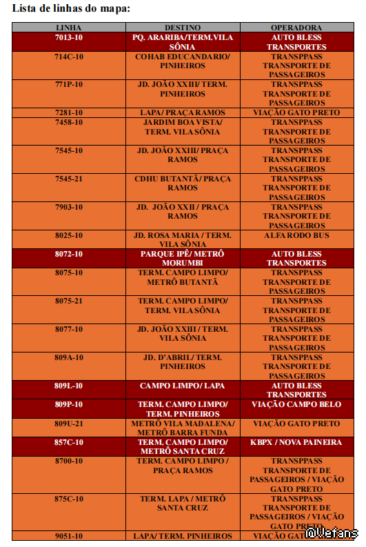 1. 地图包含 21 条线路,全部来自 SPTrans。在版本 2 中,我正在考虑加入哪些 Artesp 线路。