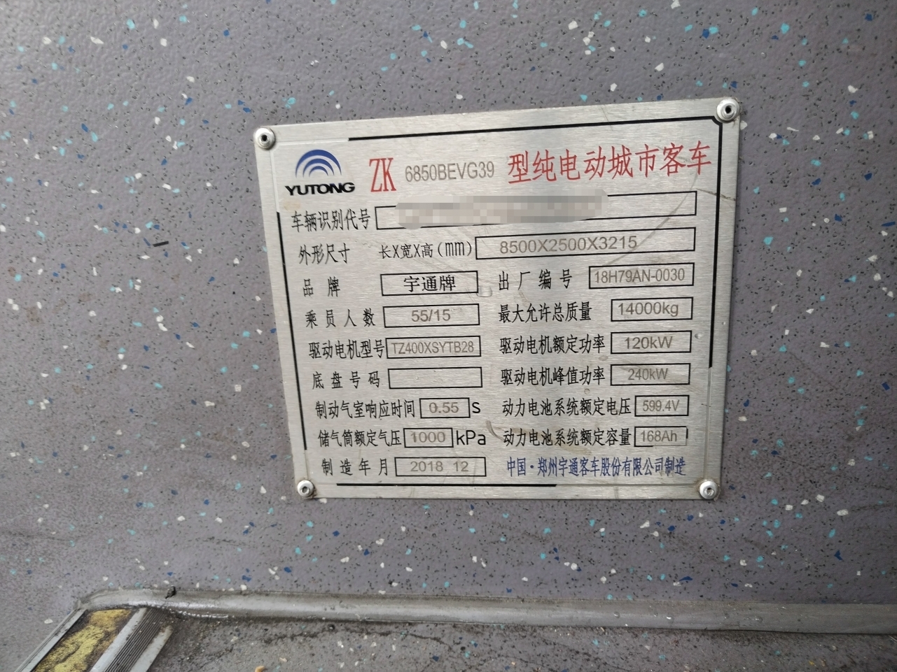 整车型号:ZK6850BEVG39