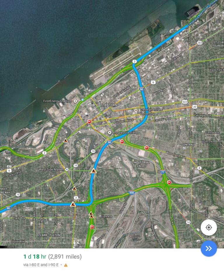 這個地方不能這麼走,Motor Carrier Road Atlas(MCRA)裡說明了I-90東行從I-490至I-77段嚴禁大型商用車輛(CMV)通行,需要繞道I-90, I-490, I-77, I-90這樣