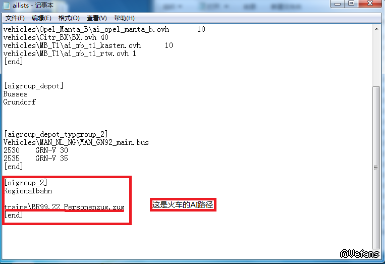 再打开刚才的ailists,把图一画横线的地方替换(前面的Trains不用换,只需要火车AI的名称)