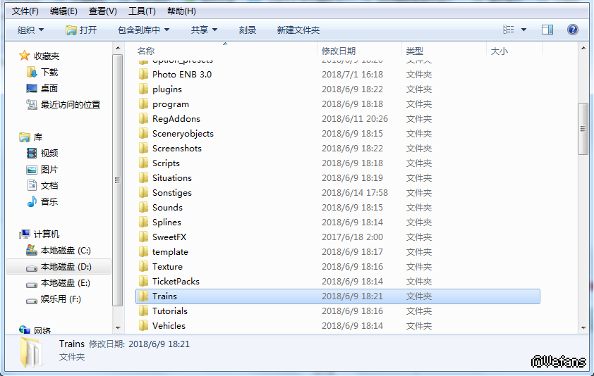 再在OMSI2的主目录找到Trains并点开,里面就是各种火车的AI