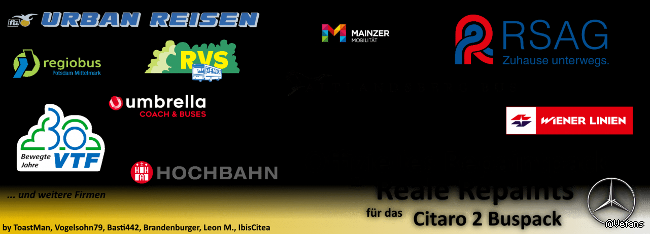 In diesem Pack sind einige reale Repaints für das Buspack von MX200 enthalten. Die Repaints wurden von einigen Repaintern erstellt. Reale Repaints für den MX200 C2 Repaintpack mit Grundlacken und Werbungen verschiedenster Firmen In diesem Repaintpack sind einige Lackierungen und Werbungen der C2 mitgeliefert, welche bis zum Zeitpunkt des Releases bzw. Fertigstellung des Archives existieren/existierten. Eine Auflistung, welche Werbungen und Lacke es für welche Busvarianten gibt, befinden sich im Spoiler unten. Die Repaints entstanden innerhalb eines größeren Zeitraums, weswegen teilweise auch die Qualität gewisser Stellen teils mangelhaft sind. Zusätzlich entstanden welche mit Zusammenarbeit mit ToastMan, Basti442, Brandenburger, Leon M, Vogelsohn79 und Bad hat Harry ツ. Hierfür danke ich nochmal. Sollten Fehler erkannt werden oder ihr wollt so einige Worte fassen, nutzt gerne die Kommentarsektion in der Webdisk.