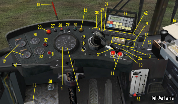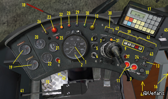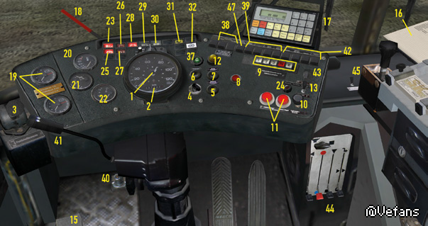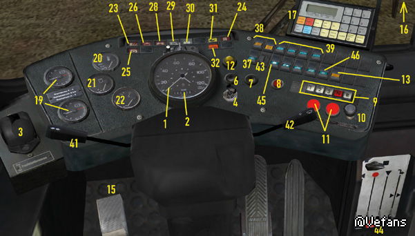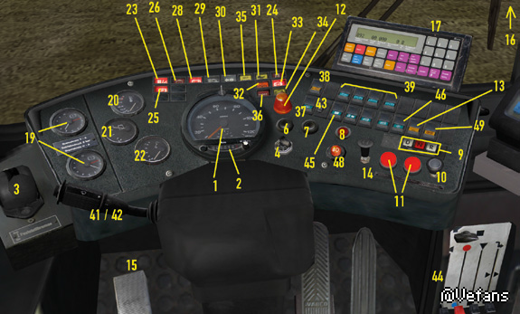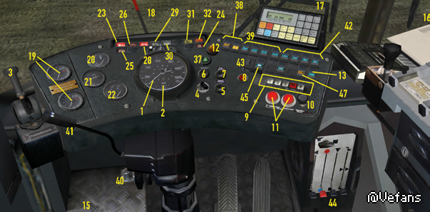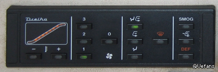 The water coolant of the SD200 and SD202 is heated by the engine and is then used to heat the passenger area. The front blower is under the front window. Depending on the position of the right lever (44), it will circulate heated fresh air (up), unheated fresh air (middle) or heated recycled air (down) through the interior. You can use the red lever, second from the left, to control the temperature and the slider (43) to determine the intensity. The NL202 and the NG272 are equipped with a modern control panel that you find over you: [Pic] You can control blower intensity using the buttons 1 to 3; the second and third position is only available while the engine is running. You turn the blower off by pressing the 0 button. As soon as the blower is active you can set the temperature using the “-“ and “+” button on the far left. Usually the front blower is using outdoor air; press “Smog” if you only want to use circulated air and press the button in the middle to use a mixture. DEF is short for “Defrost” and heats the windshield. In the passenger area, there are several heaters, which you can control with the switch (45). You cannot control the temperature. The effectiveness of the heating system is dependent on the temperature of the coolant. To warm up the coolant on cold days, which on the one hand will get the bus ready to drive sooner and on the other hand makes the internal heating more effective, you can turn on the auxiliary heater (37). The auxiliary heater only works until the coolant temperature reaches approx. 70 °C (158 °F). Try to keep a comfortable interior temperature! And make sure that the passengers get enough air. The windows in the cabin or in the passenger area can be opened to let in some fresh air, and the heating system can also provide ventilation. Don’t leave the doors open too long on cold days, though, or it will get too cold inside. There’s a small digital thermometer in the cabin so that you can keep track of the temperature.