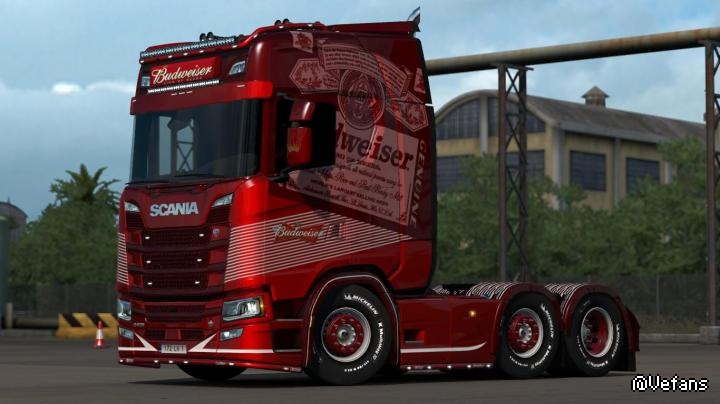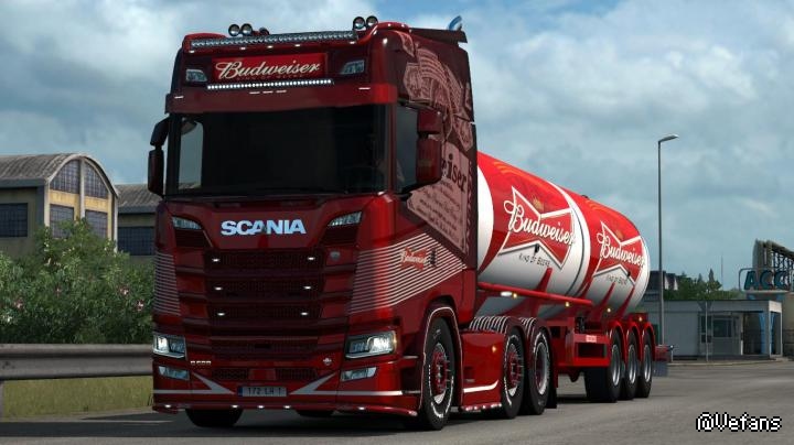 Budweiser Scania & Trailer Skins V1 mod for ETS2 1.35.x. – Skin for Scania S Highcab only. – Skin for Trailer Can Tanker.