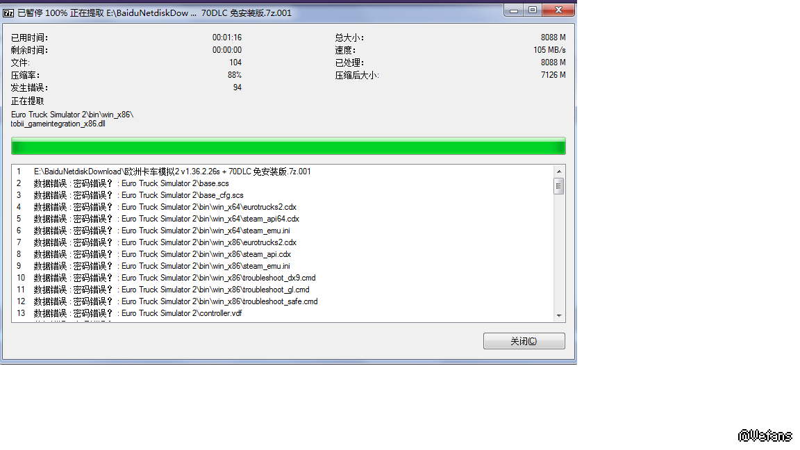 关于歐洲卡車模擬2 v1.36.2.26s + 70DLC 免安裝版解压时出现错误的问题