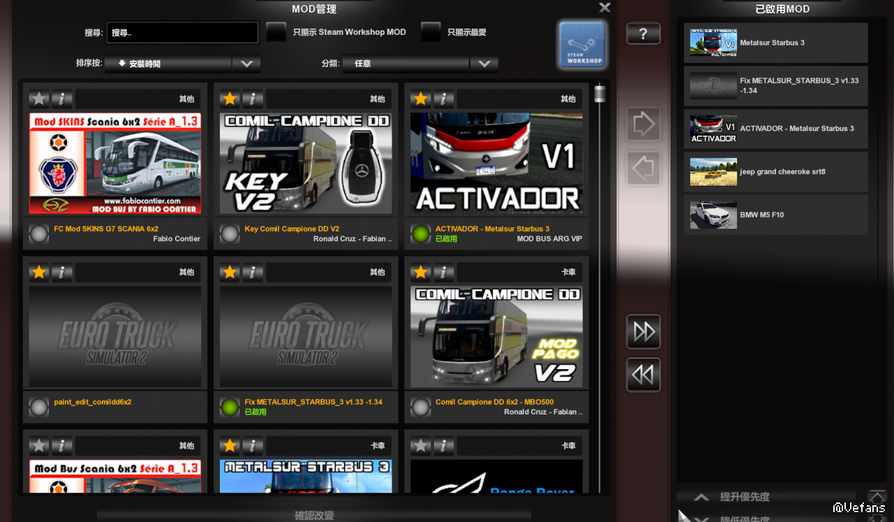 不要和其它客车或者卡车模组同用把那jeep及BMW丢垃圾桶去!优先级高到低依次是:Fix METALSUR_STARBUS_3 v1.33 -1.34 ACTIVADOR_STARBUS3_MODBUSARGVIP METALSUR_STARBUS_3_Multichasis_MODBUSARGVIP 模组是1.28的老模组只是更新DEF让其在1.34上出售个人建议新档玩.........告辞!