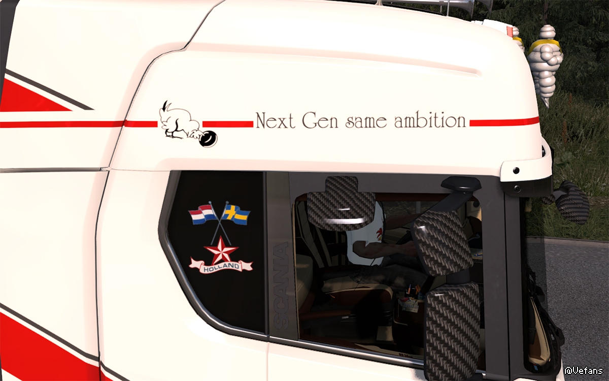 重制全套鸡仔车皮肤(同步文字。小鸡。窗标。发动机徽标至官方状态)镜子后挡泥盖和防撞板改碳纤维纹理其它按个人喜欢改!货柜适配到新版schmitz S.KO!车辆标配LED灯组
