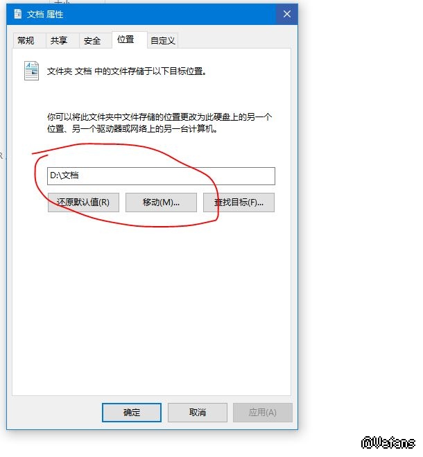 右击【文档】→【属性】→【位置】→【移动】→自己决定