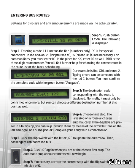 进入公交线路显示和任何公告的设置是通过售票机。步骤1:按按钮升/秒以下显示:步骤2:输入代码。我是指线(数字)。不锈钢是特殊字符。在添加28(M为前缀),35(N)和36(X)是必要的。对于一般的行,你必须输入00。在这里输入00和KK。存款准备金率是三位数路线编号。您将找到进一步的帮助,选择正确的路线在路线列表或块调度。我们的例子是线X10和路线2。打字错误可以用红c-button校正。你必须确认完整的代码与绿色按钮“输出”。步骤3:与路线对应的目标代码显示。通常情况下,它必须再次确认,但您可以选择一个不同的目标号码,在这一点上,以及。步骤4:选择第一站。自动选择路线的第一站。如果该显示器被预先设定在一个稍后的停止,您可以通过其左和右侧的箭头按钮跳过它们。完成您的输入确认。步骤5:单击翻转开关信„Q”更新的外观。然后,乘客可以登上巴士。步骤6:单击“„Q”又当你在选择的第一站。自动停止公告将开始。步骤7:如果有必要,正确的电流停止与翻转开关的左侧的问题。