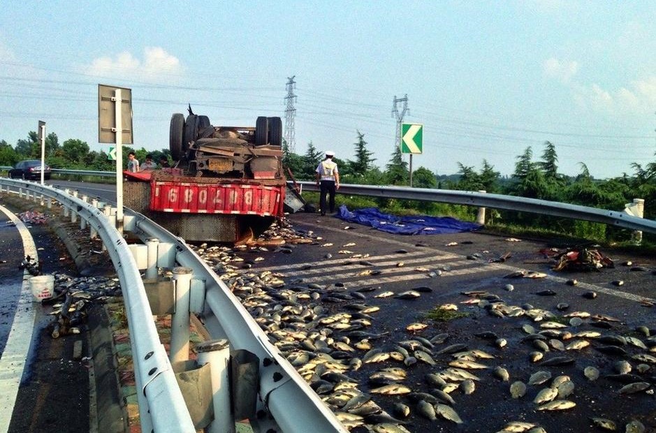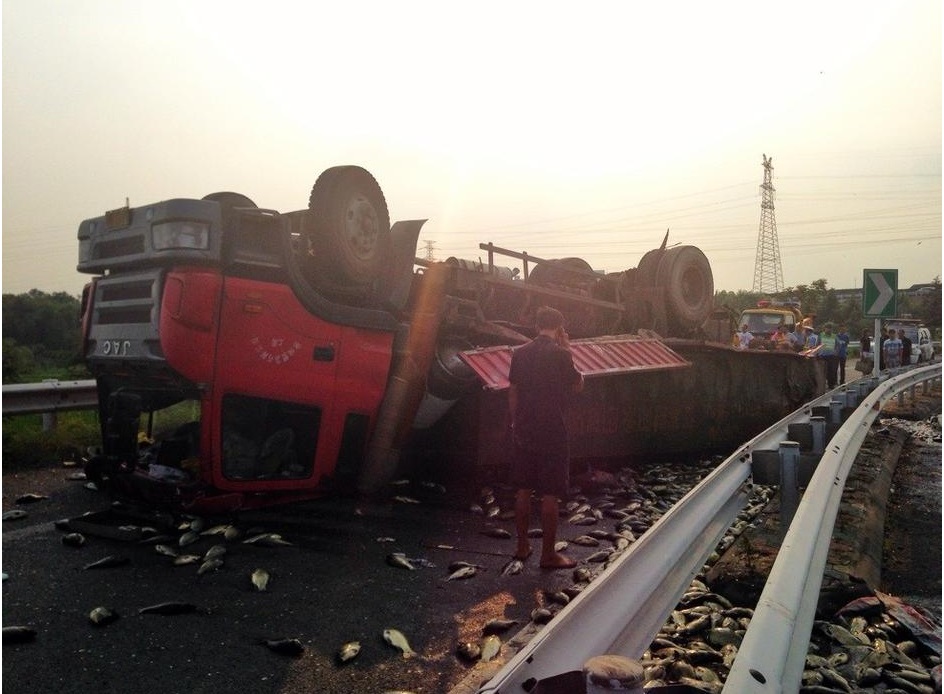 2013年7月29日下午,江苏镇江,一辆运送鲜鱼的货车因为操作不当,在连接扬溧高速公路和沪蓉高速公路的丹徒互通内翻车,三万斤活蹦乱跳的鱼儿洒满匝道路面,一时造成道路单向中断,幸亏人员没有大碍。可惜的是,由于高速路面气温太高,大部分的鱼儿捡着捡着就“烤熟”了!29日下午4时30分许,镇江交巡警高速公路二大队巡逻民警接到报警,称扬溧高速公路丹徒互通内有货车翻车,造成严重路堵。
