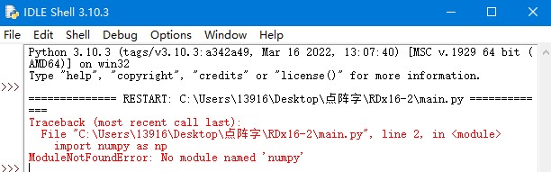 必装运行库没安装。cmd管理员运行输入pip install numpy。如果还是报错那就继续install提示的运行库