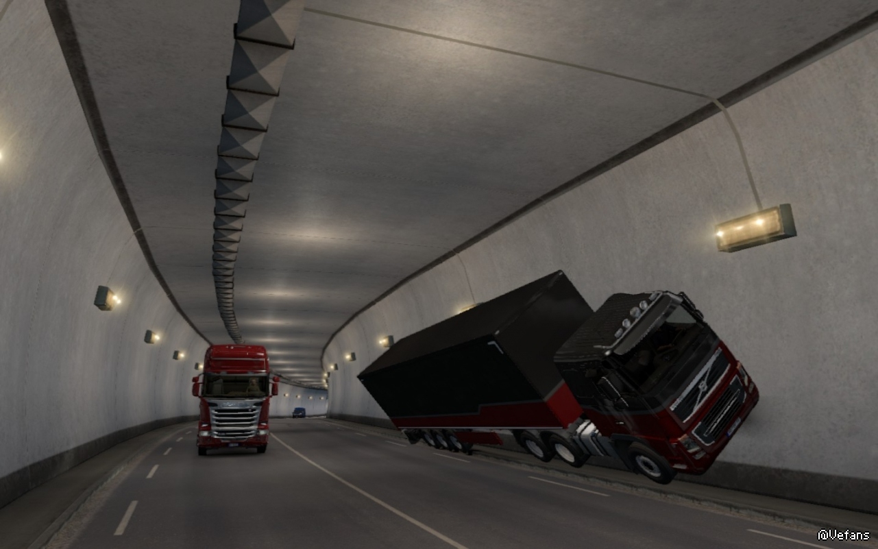 误打误撞地飞檐走壁,吓得后面的斯堪尼亚都呆了,灵魂穿模,看起来卡车撞隧道壁会弹起来耶