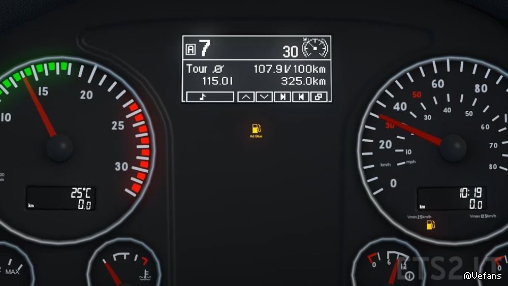 Includes:– Accurate bitmap/LCD fonts– Arrow icons for L/H splits for manual gearbox– Retarder indicator– Reworked clock and ambient temperature display below tachometer/speedometer– Reworked gear display (Rm for first reverse gear)– Trip Distance– Odometer– Average Fuel Consumption (page fixes this at L/100km, so display is ‘inaccurate’ if you change the units)– Fuel Remaining– Fuel Distance Remaining– Low Fuel Warning– Service Warning– Oil Temperature– Turbo Pressure– Instant Fuel Consumption bar– Battery Voltage (fake)– Engine hours– Cruise Control display