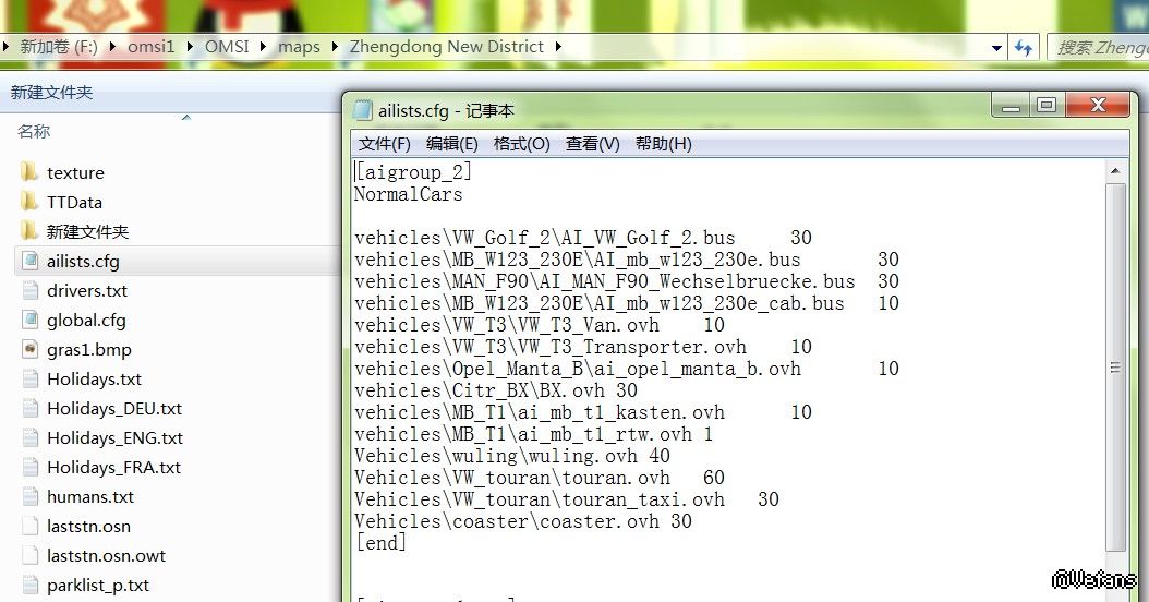 为什么我如图1修改了ailists,加入了中国式AI车(coaster,VW_touran和wuling)之后,进入地图却发现一辆“中国式AI车”都没有(见图2,3)?我已经安装了这些AI车的文件(见图4)。