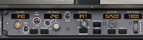 单位英尺,黄色的粗线代表地面海拔,粉色方框代表自动驾驶仪目标高度。它旁边的扇形仪表是垂直速度计。