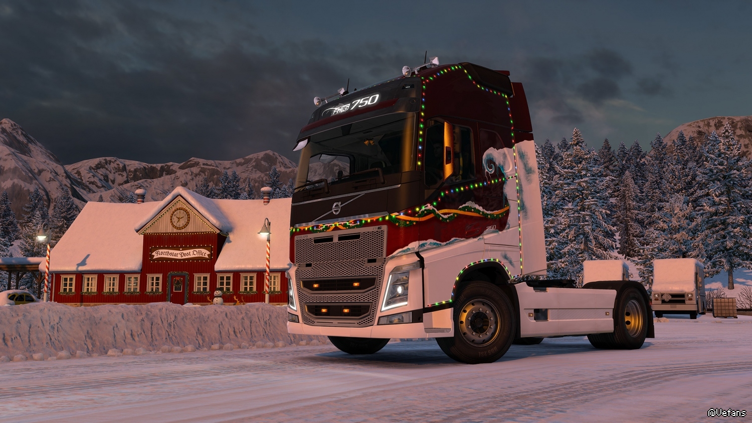 在《欧洲卡车模拟 2》(Euro Truck Simulator 2)、《美国卡车模拟》(American Truck Simulator)或两者中使用与 “卡车世界”(World of Trucks)连接的配置文件,使用外部合同,在尽可能多的城市运送物资和礼品包往返于圣诞冬日乐园。