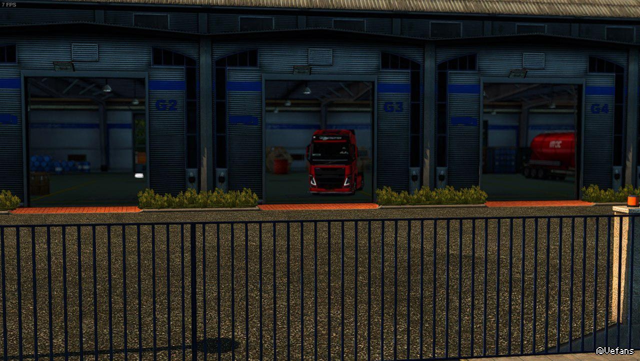 - adds parked trucks (with trailers) in the empty bays of the garage