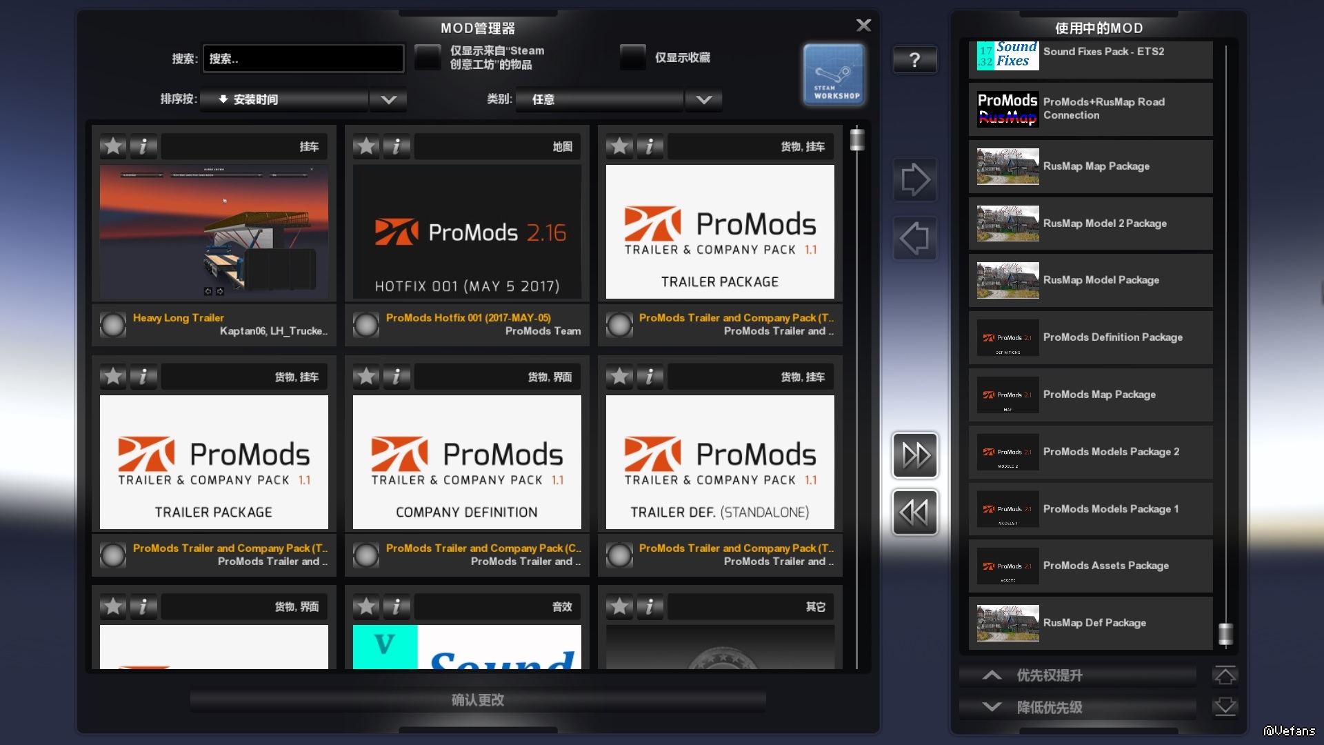 我按照这个顺序加载(如图)也就是官方顺序,可是读取后也就是过场画面后(挺漂亮的)显示加载失败,点继续加载,还是失败,重复如此,单独用promod没问题,是不是rusmod有碎坏?