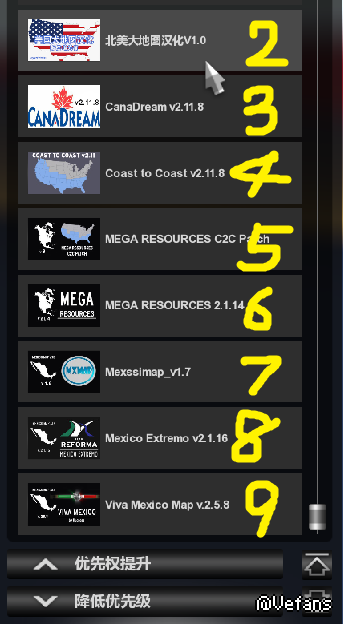 【温馨提示】1.在欧卡2或美卡当中地图文件永远排在MOD最下面!而美卡中墨西哥地图则永远排在所有地图MOD的最下面!!!