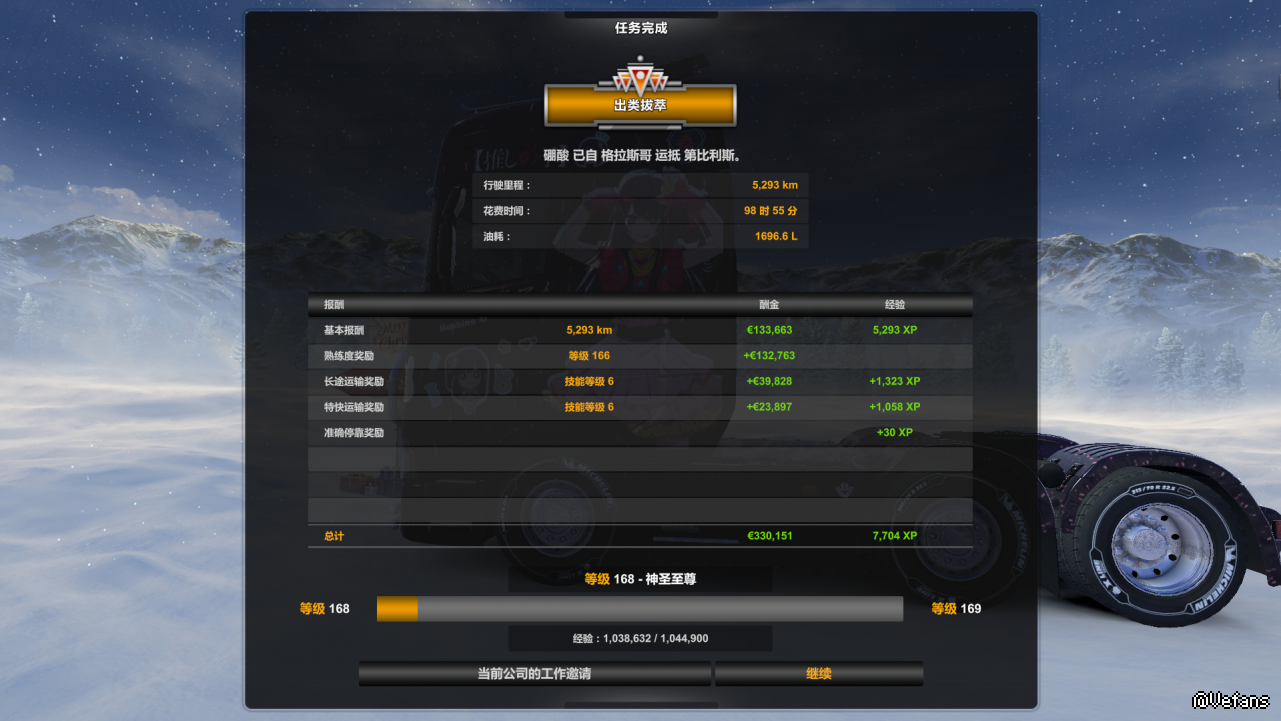 我个人目前跑的最长的一趟:英国格拉斯哥到格鲁吉亚第比利斯,全长5293km,途径英国、法国、比利时、德国、奥地利、斯洛文尼亚、克罗地亚、塞尔维亚、保加利亚、土耳其和格鲁吉亚共计11个国家,用到了ProMods、ROEX和AZGE三个地图mod。游戏中跑了四天多一点,现实中也用了四个晚上的时间跑完的。这次特意用的自己的挂车跑的(我个人不习惯买挂车),并且使用了创意工坊上的涂装。