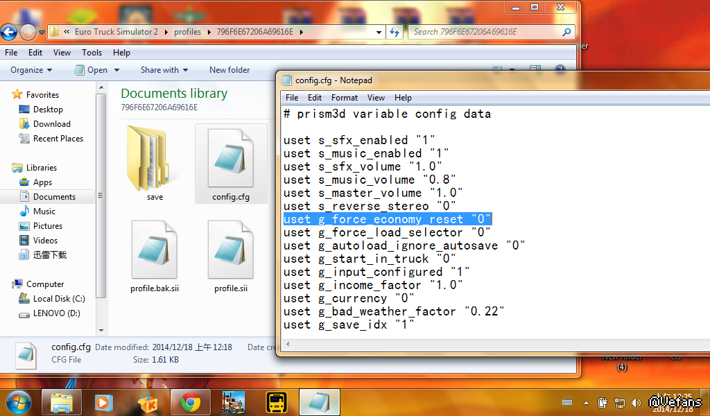 1. 在Documents\Euro Truck Simulator 2\profiles\[你的profile]中找出config.cfg並用notepad打開