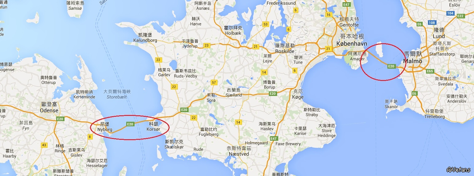 上圖右邊連接 哥本哈根-- Malmö (馬爾默) 在地圖上有兩段,