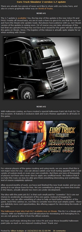 創建和使用MODS遊戲的老玩家,我們都知道,這是不是主要的消息告訴你-你總能滿足你的卡車調諧食慾,具有廣闊的各種定制MODS,甚至自己的創造力。但也有幾十名球員那裡從來不敢申請任何非官方的mods。我們相信,如果我們走這條路,我們也許能夠給他們一些有趣和有價值的。當然,完全可選的。 經過幾個月的工作,我們剛剛完成了新的卡車模型,我們給它免費為我們的玩家基礎。我們致力於在未來給你更多的自由卡車,實際上已經兩個正在開發中。 用的油漆工作DLC的想法是,這麼小的付費的“化妝品”的DLC是我們的機會,加快發展的核心遊戲。而不是乞求捐款,我們可以提供一些有價值的東西來幫助我們資金的進一步演變的遊戲。如果這漁獲,我們想考慮更多的不僅僅是簡單的油漆-有肯定更冷靜的機會,像裝飾的船艙內提供支持。萬聖節油漆工作包DLC現已在Steam。此DLC一個蒸汽釋放。在我們有限的後端基礎設施的貨幣化和管理的DLC,我們不會提供它從官方網站上, 我們希望您享受駕駛的全新沃爾沃FH和盡可能多穿那些漂亮的萬聖節油漆工作,因為我們喜歡創造!謝謝你!