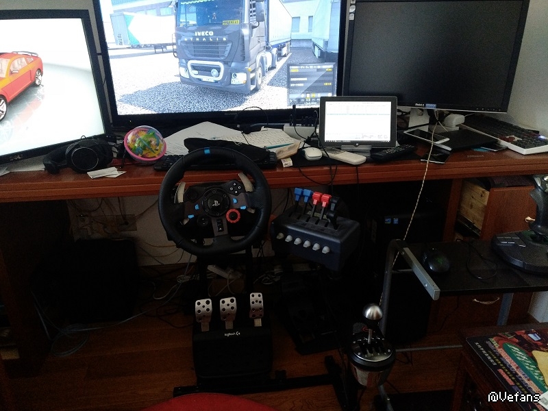 G29+T500+CH4发节流阀。亮点在CH的4发节流阀上,这是我以前玩模拟飞行的设备,发现ETS2也支持,就直接把所有功能都设在上面了,可以实现一键启动,驻车,发动机制动,缓速器,挂车刹车,灯光,高低档位切换,升降桥。反正可以做到完全不用脱离设备开卡车,那代入感棒极。虽然我有3个显示器,但是由于尺寸很奇葩分别是27,42,24,所以没法组三屏,就用了TRACKIR5头瞄。 [local]2[/local]