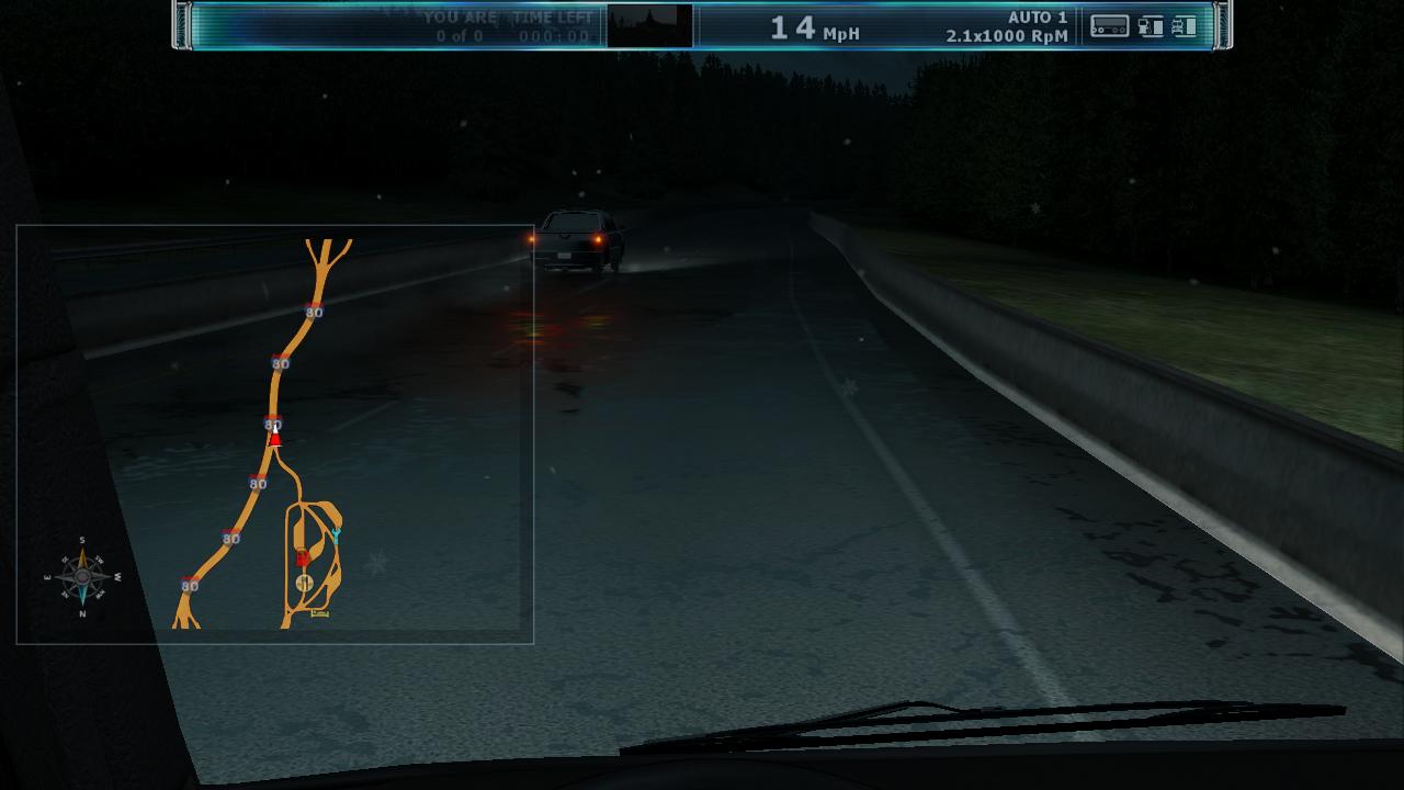 下雪天,刹车稍微久一点就会侧滑,转弯速度不敢大于30,要不根本转不过来,平路加速一按ctrl键(急加速)必打滑,不按ctrl倒是不打滑,可是慢的要死(怀疑rnr中的卡车自带esp、驱动力控制等等辅助装置)。